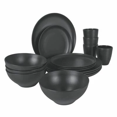 Cet ensemble de vaisselle tendance de 16 pièces Orville anthracite de la marque Bo-Camp est fabriqué en mélamine résistant, un matériau plastique pratiquement incassable, résistant aux rayures et léger.