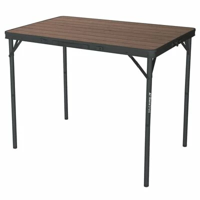 La table pliable en deux en marron et noir, en aluminium, est équipée d’un dessus en bambou hydrofuge. Elle est conçue avec un cadre en aluminium de 2 hauteurs différentes et des pieds réglables.